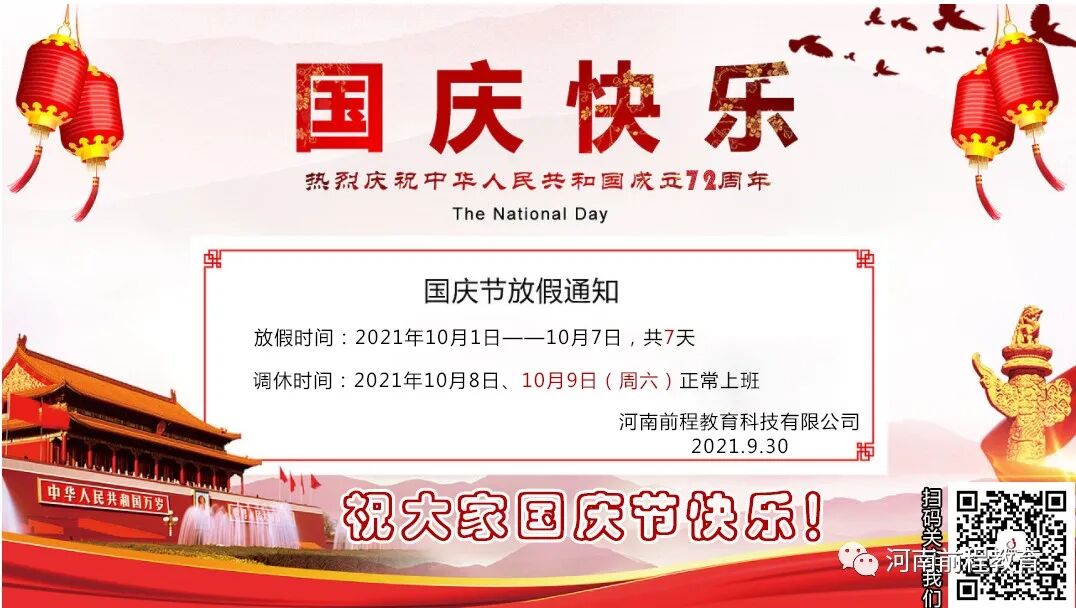 以上就是河南普通话考试网为您介绍的关于“河南前程教育2021国庆节放假通知”的相关内容,希望对您有所帮助!如果您有什么问题或者要咨询的,欢迎添加我们的官方微信公众号在线提问,我们将耐心为您解答!